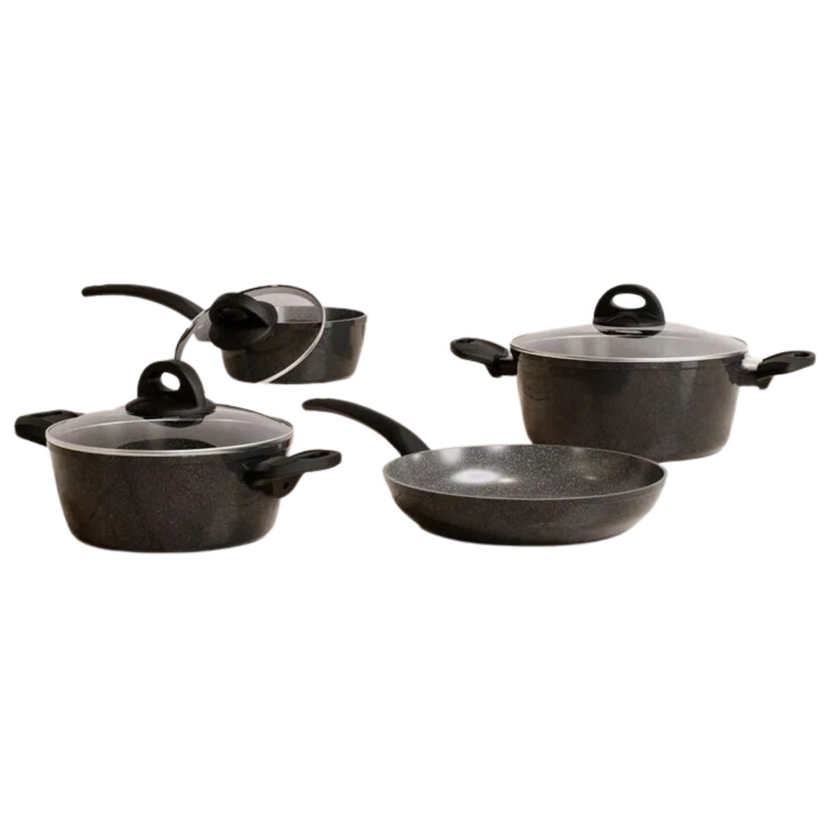 Conjunto de Panelas Ibiza Black Stone 4 Peças: Qualidade e praticidade na sua cozinha. Cabo e alças de soft touch para conforto e firmeza no manuseio, com redução da propagação de calor. Revestimento cerâmico antiaderente que não gruda e facilita a limpeza, resultando em menos uso de óleo. Tampa de vidro temperado com saída de vapor. Inclui 4 peças: caçarola com tampa (24cm), caçarola com tampa (20cm), panela (16cm) e frigideira (24cm).